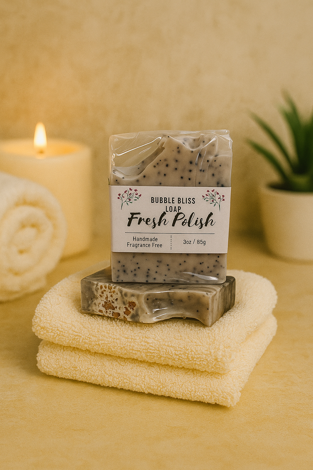 Give your skin a natural, refreshing reset with our Fresh Polish Bar, a handcrafted exfoliating bar designed for gentle yet effective care. This fragrance-free formula is perfect for sensitive skin or anyone looking to keep their routine clean and simple.